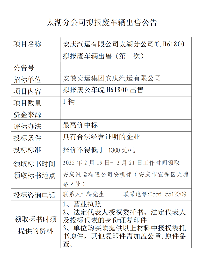 太湖分公司擬報(bào)廢車(chē)輛出售公告