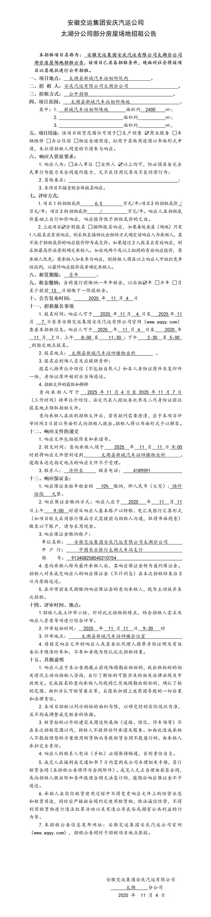 太湖分公司部分房屋場地招租公告
