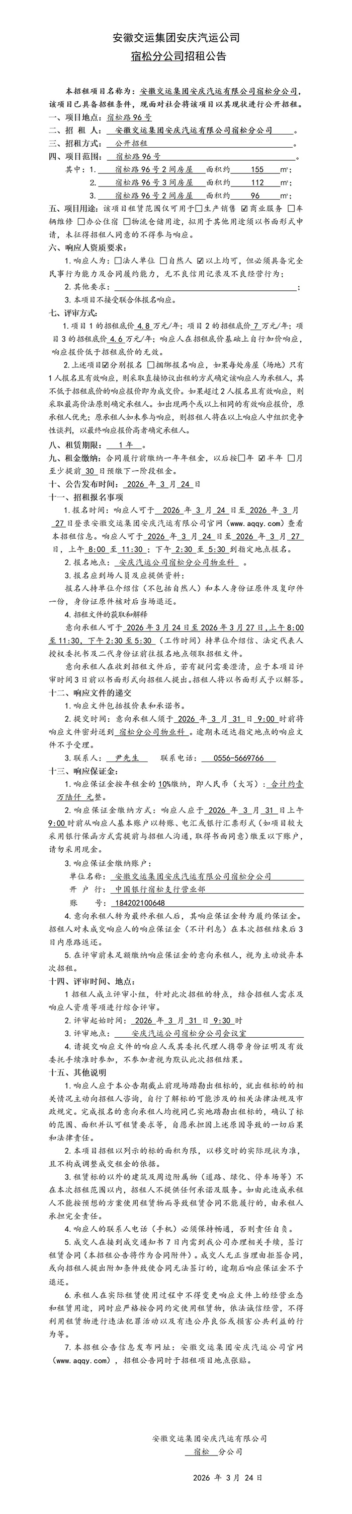 宿松分公司房屋(場(chǎng)地)招租公告